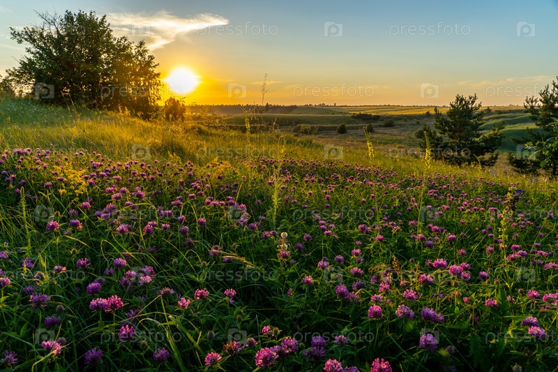 Пейзаж, закат над лугом, овраг, заросший цветами и травами