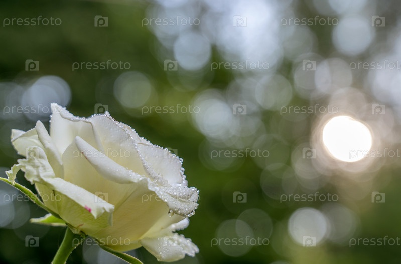 Цветок белой розы в каплях росы крупным планом на фоне размытой зелени и солнца, пробивающегося сквозь листья