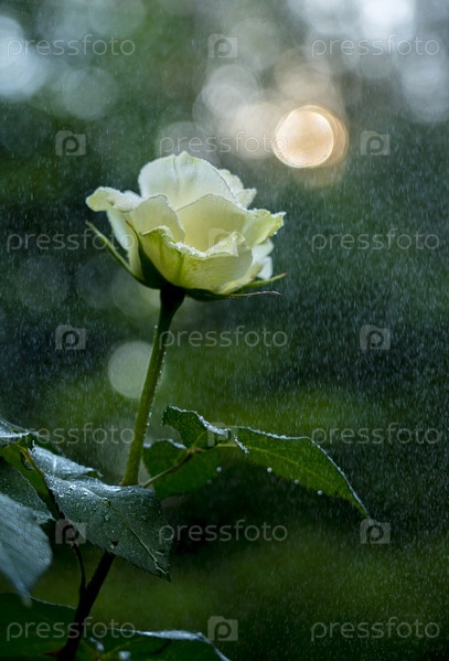 Цветок белой розы в каплях росы крупным планом на фоне размытой зелени и солнца, пробивающегося сквозь листья