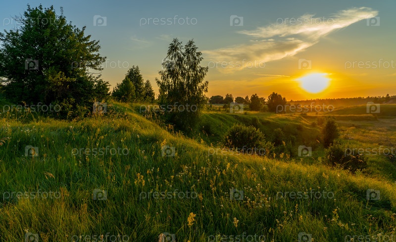 Пейзаж, закат над лугом, овраг, заросший цветами и травами
