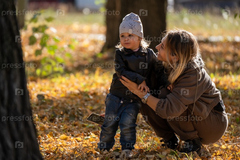 Счастливая мать и ребенок играют в осеннем парке