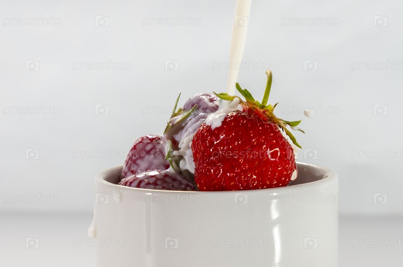 Белая чашка со спелой клубникой и поверх клубники наливаем сливки крупным планом на белом фоне