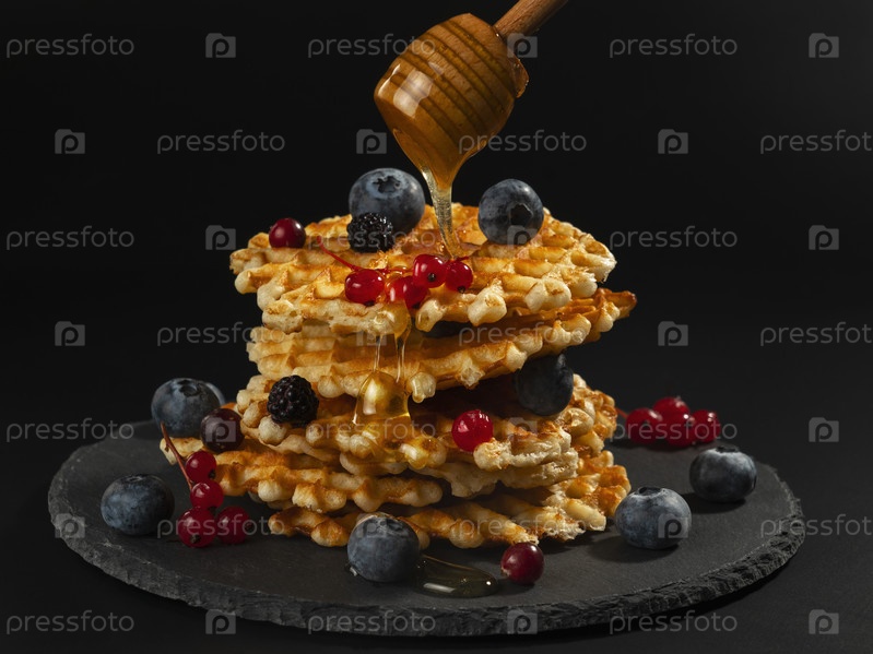 Свежие хрустящие бельгийские вафли со свежей черникой, ежевикой, клюквой и красной смородиной