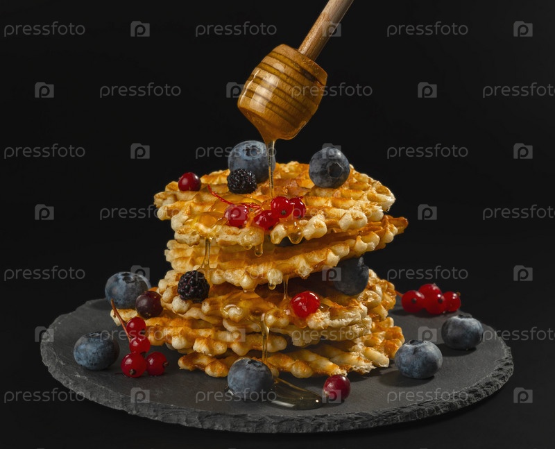 Свежие хрустящие бельгийские вафли со свежей черникой, ежевикой, клюквой и красной смородиной