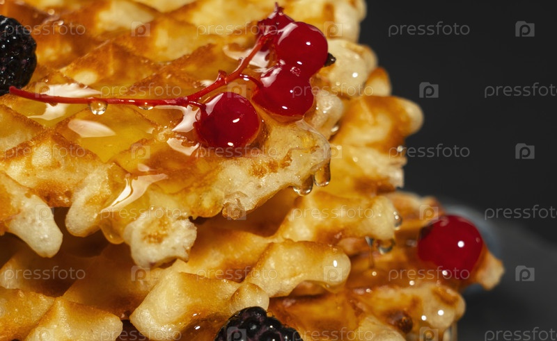 Свежие хрустящие бельгийские вафли со свежей черникой, ежевикой и красной смородиной, залитые свежим медом крупным планом