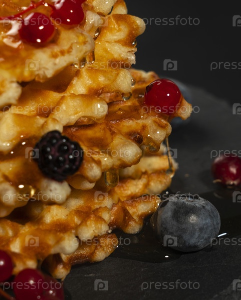 Свежие хрустящие бельгийские вафли со свежей черникой, ежевикой и красной смородиной, залитые свежим медом крупным планом