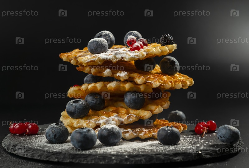Свежие хрустящие бельгийские вафли со свежей черникой, ежевикой, клюквой и красной смородиной