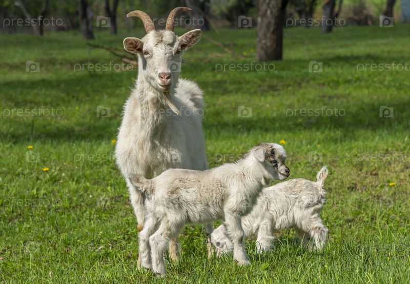 Белая коза с двумя молодыми козами стоит на зеленой траве и смотрит в камеру