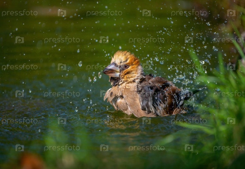 Ястребиная птица купается стоя в пруду крупным планом