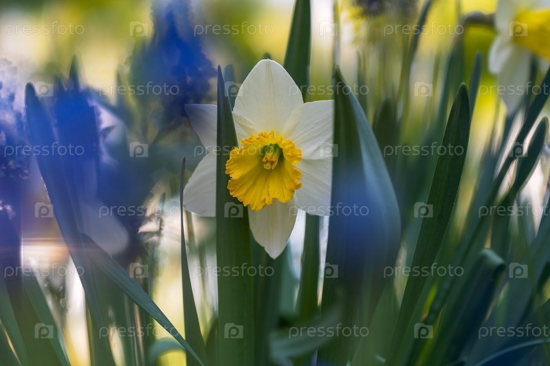 Весеннее цветение нарциссов на фоне заходящего солнца