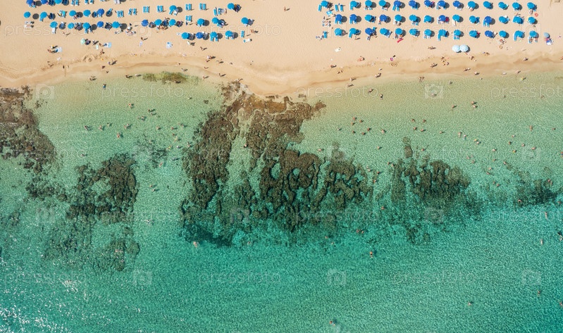 Линия пляжа и коралловый риф на Средиземном море в Протарасе, Кипр, вид с воздуха