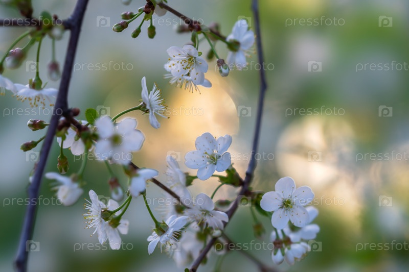 Цветущая ветвь вишни с красивыми белыми цветами на фоне диска солнца на закате