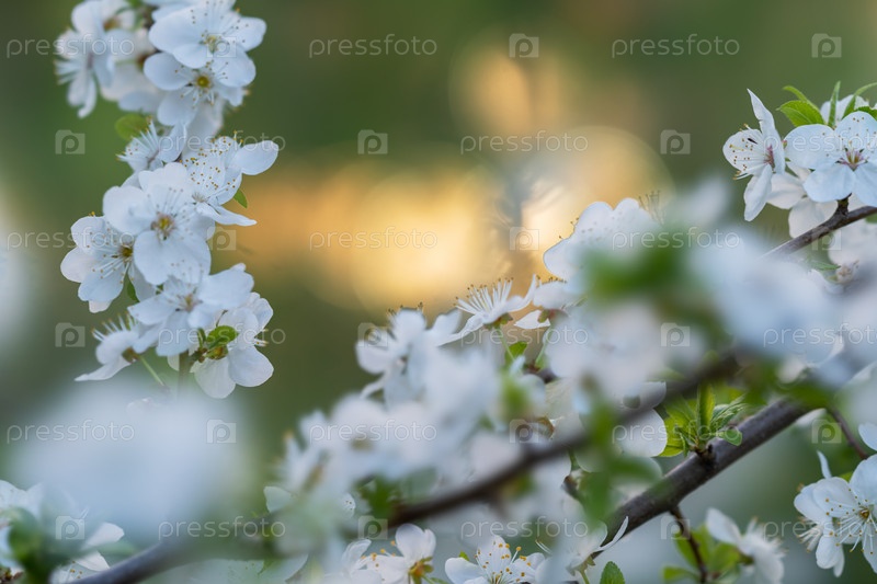 Цветущая ветвь вишни с красивыми белыми цветами на фоне диска солнца на закате