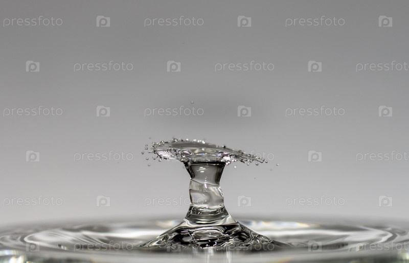 Капли воды падают с высоты чистой, прозрачной воды, образуя брызги в виде оригинальных форм зонтиков, грибов и корон