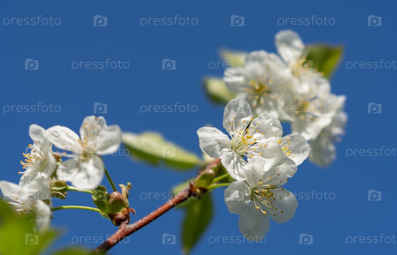 Цветущая ветвь вишни с красивыми белыми цветами на фоне ярко-голубого неба