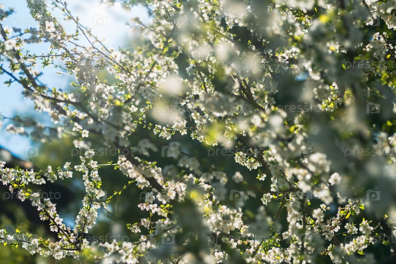 Цветущая ветка вишни, сфотографированная специальным объективом, дающая великолепный боке, фон