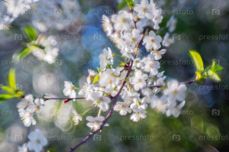 Цветущая ветка сакуры, сфотографированная специальным объективом, дающим великолепное боке