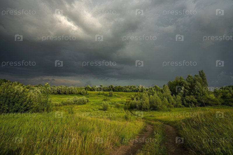Извилистая грунтовая сельская дорога, идущая по освещенному солнечным светом лугу, а над ней грозовое небо со свинцовыми тучами