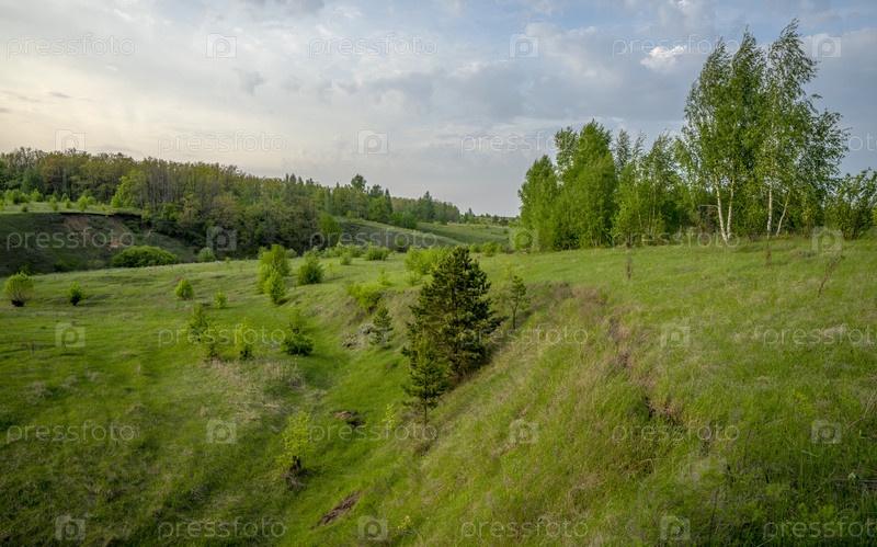 Красивый пейзаж на закате в овраге, сосне, березе, траве