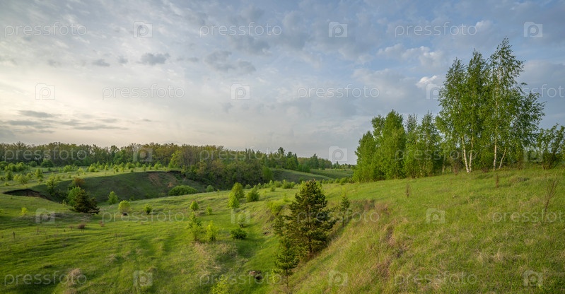Красивый пейзаж на закате в овраге, сосне, березе, траве