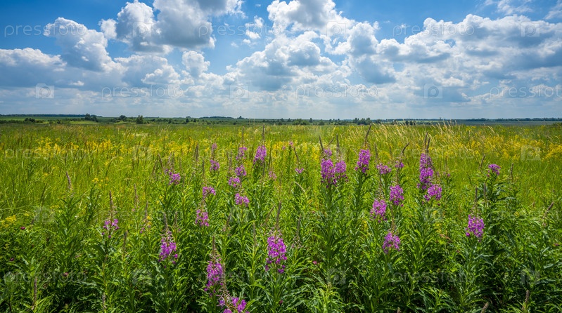 Луг с полевыми цветами и иван-чаем на фоне ярко-синего летнего неба
