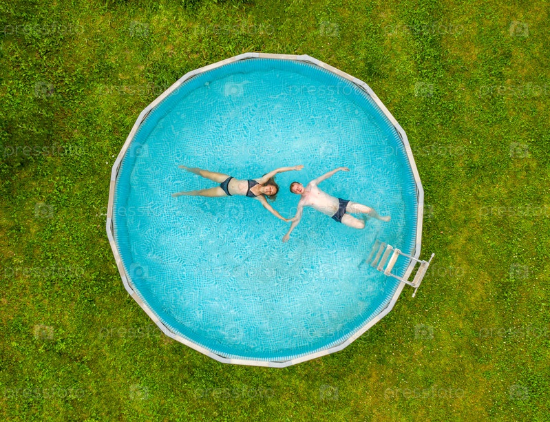 Аэрофотоснимок, парень и девушка лежат на поверхности воды в круглом бассейне