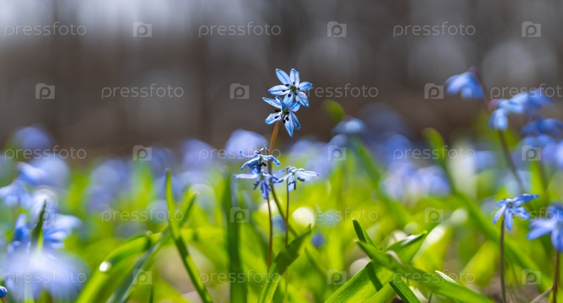 Пролеска цветет в весеннем лесу крупным планом, яркое солнечное утро