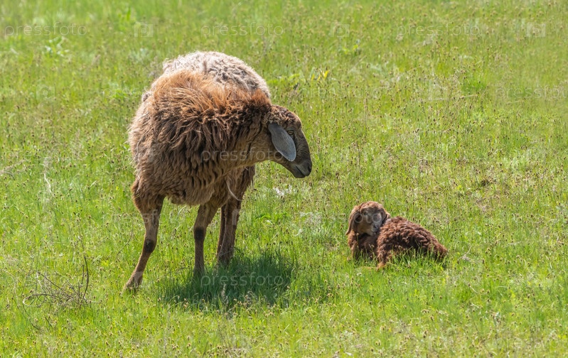 Овца с молодым ягненком пасется на зеленом лугу среди сочной травы, крупным планом