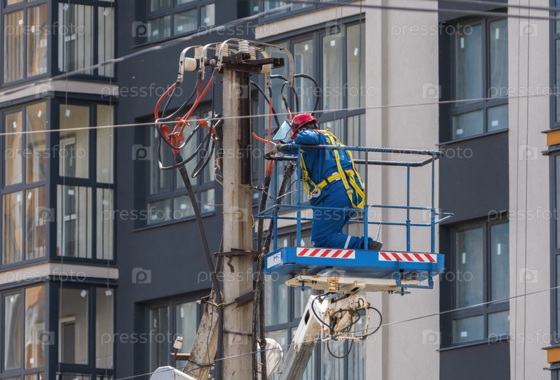 Электрик, поднятый в люльке башенного подъемника, монтирует провода на столб на фоне высотного здания