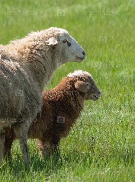 Овца с молодым ягненком пасется на зеленом лугу среди сочной травы, крупным планом