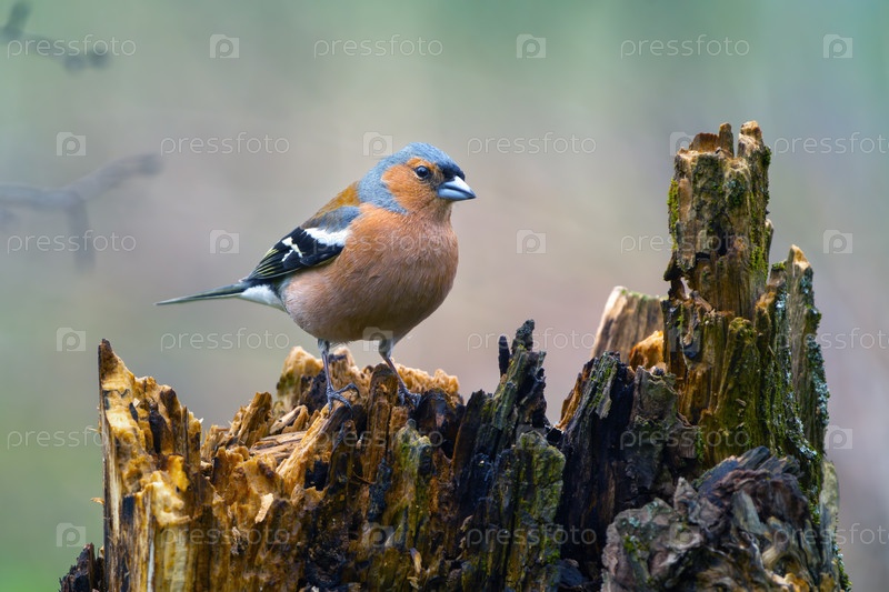 Птичий зяблик на старом гнилом пне в весеннем лесу крупным планом