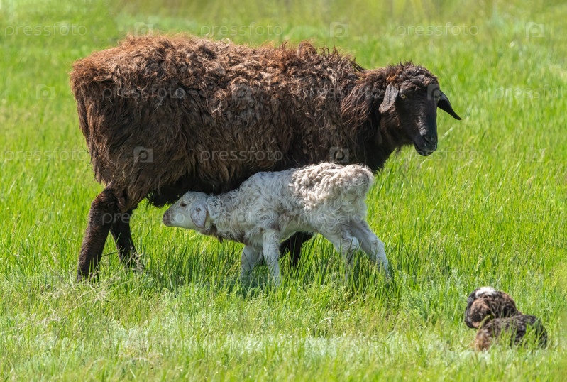 Коричневая овца с маленьким белым ягненком на лугу среди сочной травы