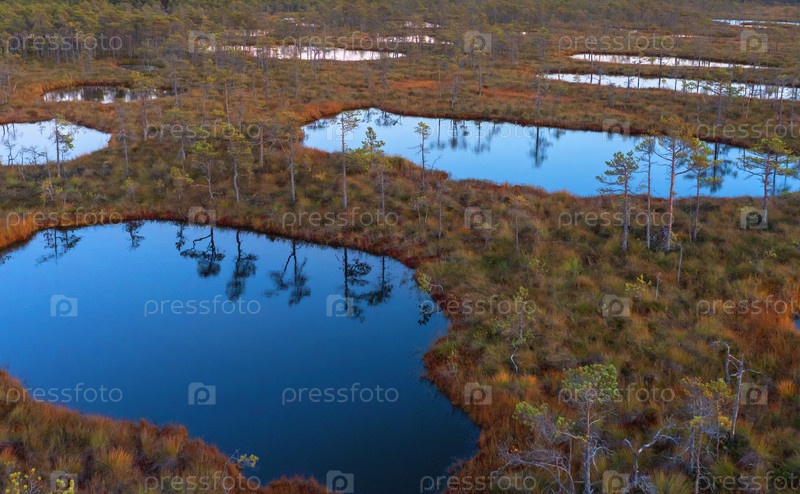 Аэрофотоснимки северных болот с озерами и растущими вокруг них невысокими соснами