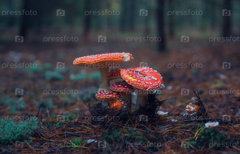 Крупный план красных мухоморов на фоне осеннего леса дождливым утром