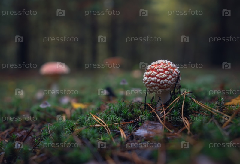 Крупный план красных мухоморов на фоне осеннего леса дождливым утром