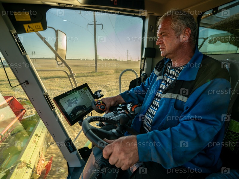 Механизатор за штурвалом современного комбайна собирает зерно