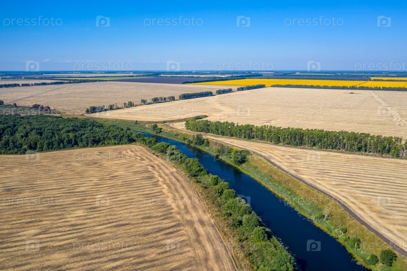 Аэрофотосъемка изгиба реки, протекающей по скошенным полям