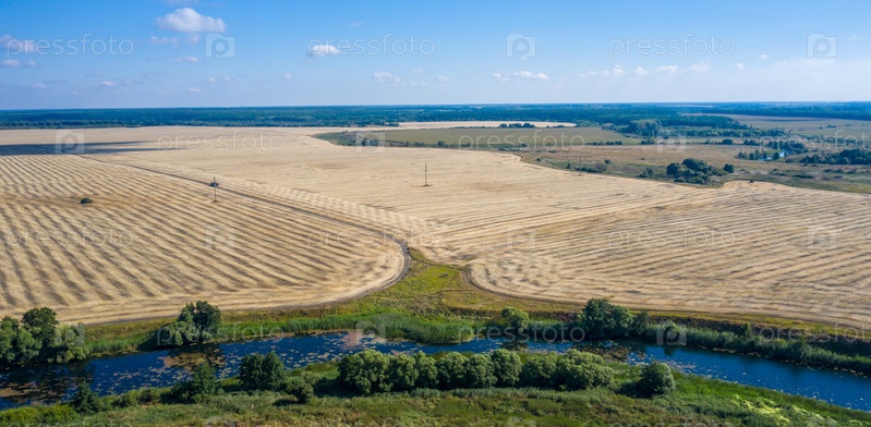 Аэрофотосъемка излучины реки, протекающей по скошенным полям