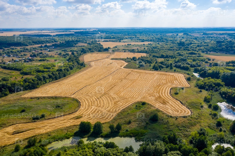 Аэрофотосъемка извилистой реки, огибающей скошенное поле и протекающей через леса и поля