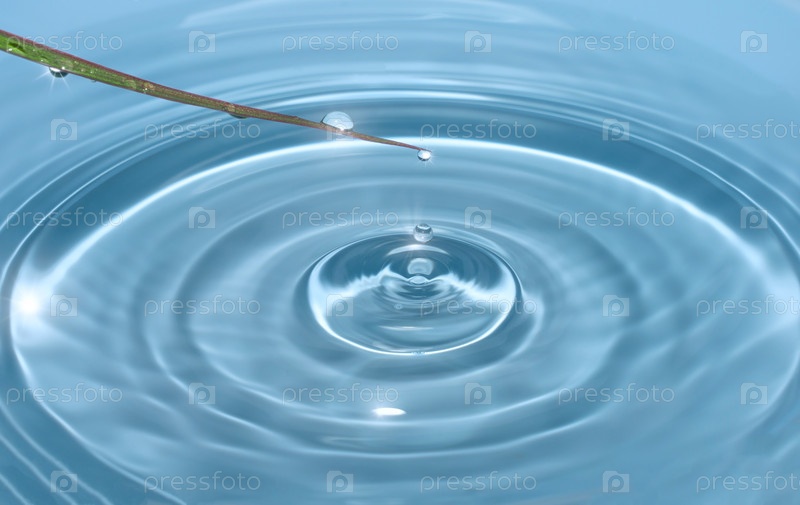 Капли росы под весенним солнечным светом падают с травинки в чистую, прозрачно-голубую воду, образуя круги на воде