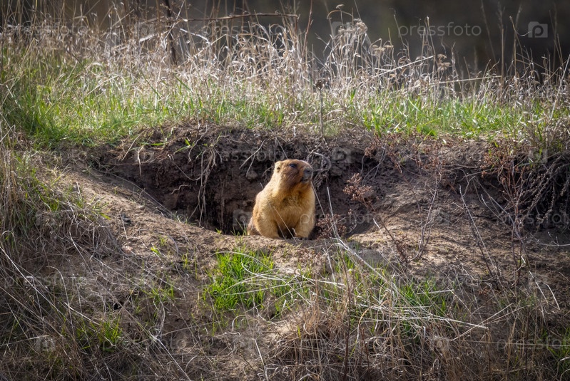 Сурок выполз из своей норы, чтобы погреться на весеннем солнце, крупным планом