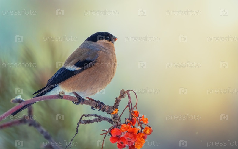 Снегирь, пиррула, сидит на ветке красной рябины в солнечный морозный день, новогодняя открытка