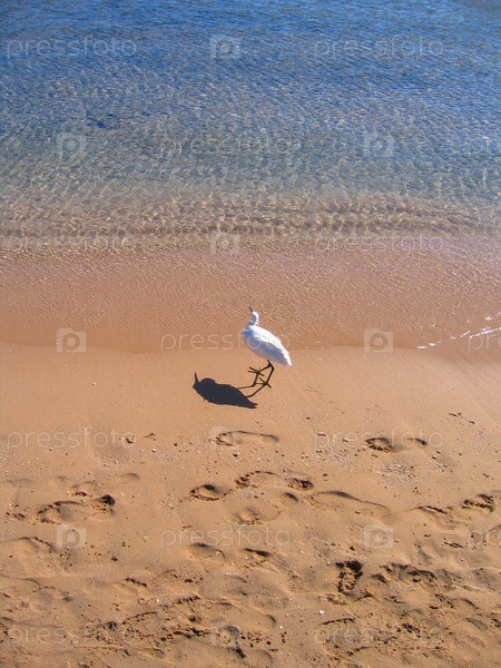 Цапля бежит по песчаному берегу Красного моря