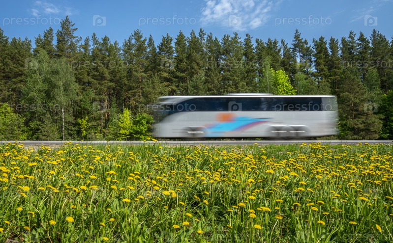 Туристический автобус мчится по дороге вдоль леса, обочина усыпана желтыми одуванчиками