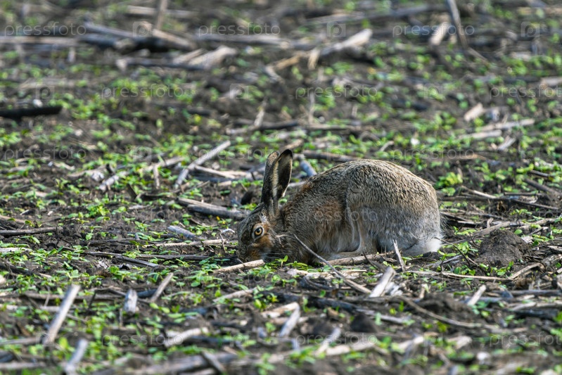 Европейский заяц сидит на весеннем сельскохозяйственном поле с остатками прошлогоднего урожая в поисках еды крупным планом