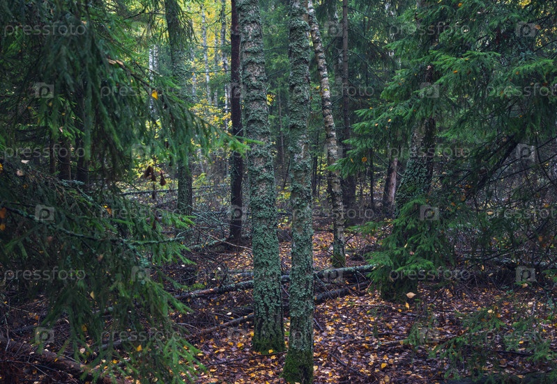 Осень в густом еловом лесу