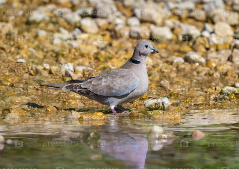 Птица Streptopelia orientalis стоит на скалистом берегу реки в жаркий летний день