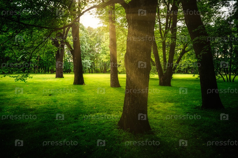 Раннее утро в зеленом парке, где среди стволов дубов растет газон, освещенный солнечным светом