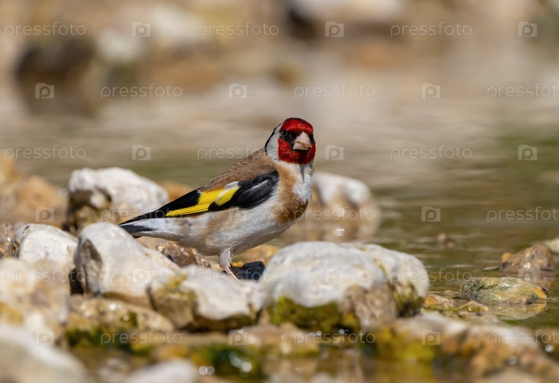 Птица щегла прилетела к водопою, скалистому берегу реки в жаркий летний день