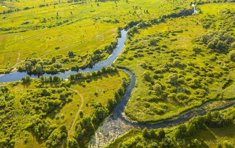 Вид с высоты птичьего полета на изгибы речных лугов и полей